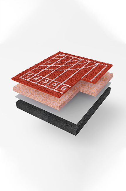 混合型塑膠跑道由底層、彈性中層、面層及劃線層組成。底層主要作用是封閉基層,增加粘結(jié)強(qiáng)度;按基層不同可以分為水性和油性兩類。彈性中層由雙組分無(wú)溶劑聚氨酯膠水和塑膠顆?,F(xiàn)場(chǎng)澆筑而成,具有良好的彈性及抗釘穿性能,全系統(tǒng)體系搭配靈活,性價(jià)比高。面層包括噴顆粒面層和自結(jié)紋面層。